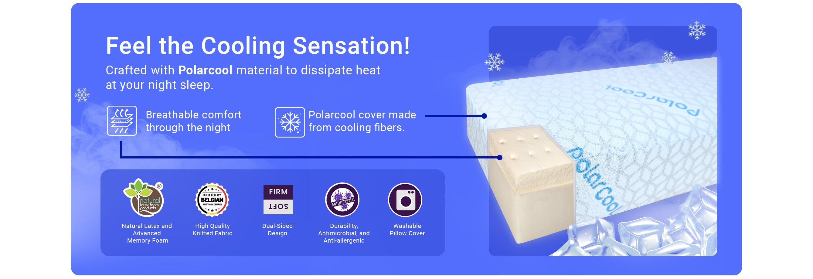Equipped with Polarcool Technology, the latest innovation from Pillowblox! A high-tech pillow cover that is 88% cooler. Say goodbye to night sweats and restless tossing—Polarcool Pillow keeps you comfortably cool throughout the night.