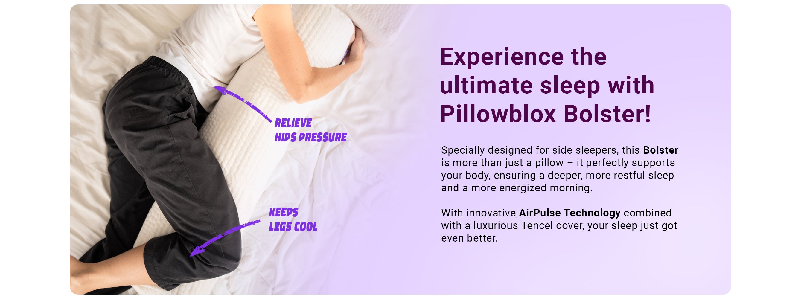 ποΈ Experience the Ultimate Sleep with Pillowblox Bolster, where innovative AirPulse Technology meets a luxurious Tencel cover. Specially designed for side sleepers, Pillowblox is not just an ordinary bolster β it provides perfect body support, ensuring a deeper, more restful sleep and a more energized morning.